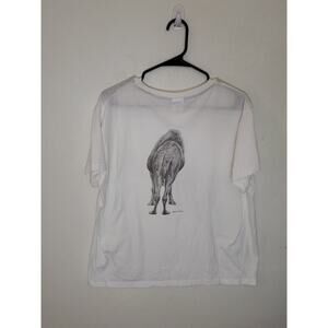 This Jerusalem Berry Men T-Shirt features a stylish camel graphic on both sides, with a comfortable round neckline and short sleeves. It comes in a slim fit style and is available in size XL. The shirt is made of solid white material and has a brand tag of berry men.