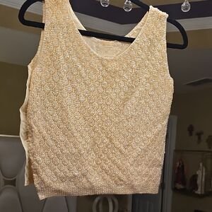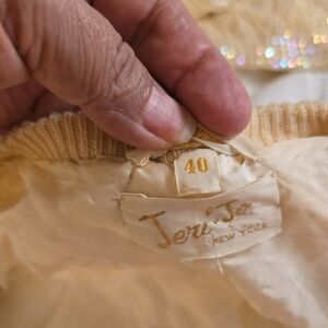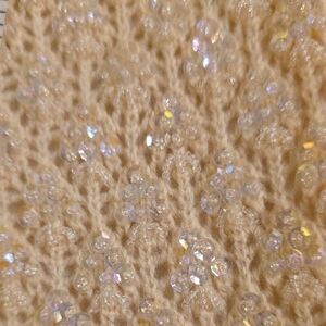 Discover elegance with this beautiful beige cardigan. Perfect for any occasion, it offers a sophisticated touch to your wardrobe. Hand beaded in British Hong Kong. 100% Wool. camisole size 34 and cardigan size 40. Both are very stretchy. Please see the pictures for the measurements. Amazing condition for the years that have passed.
