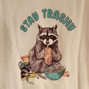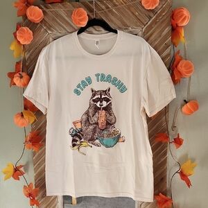 Classic Jerzees t-shirt in a soft cream color. Comfortable and stylish. Racoon with food and boba. Stay trashy. No flaws.