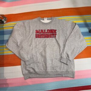 Classic gray crewneck with bold Malone University print. Comfortable and stylish for any occasion.