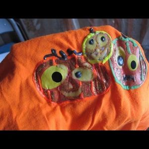 Feather at the end of the sleeves. Looks like glow in the dark and glitter paint added over jack o lanterns. Seems like a home made short for halloween.