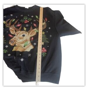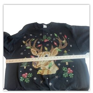 Black with holiday theme Reindeer pressed on, crew neck, unisex, colors may vary due to lighting, good used condition, XL