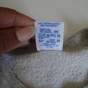 Pre-owned...there is a small hole in the seam of the lower band (see the close-up picture of the hole). There is a light stain on the lower front of the shirt (see the close-up picture of the stain). The sweatshirt has wash wear/piling throughout. There is also piling on the inside (see last 2 pictures for examples)