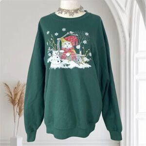 Jerzees VTG Nostalgia Cat Dark Green Christmas Snow Crewneck Sweater M