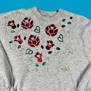 Gorgeous hand embellished crewneck sweatshirt. The sweatshirt has beautiful metallic red roses, green leaves, and yellow glitter embellishments that were drawn on the shirt. The shirt is made in the USA, Jerzees top in a size XL.