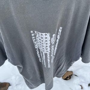 Mens Jerzees tee shirt , grey with white lettering shirt, size 2xl , measures pit to pit 24 inches , length 41 inches.