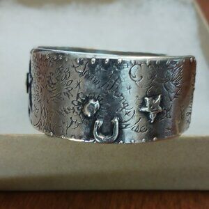 Beautiful silver cuff bracelet by Jes Maharry. 7/8 " wide, single diamond encased in gold. Circumference of 2.5 ", oval shape.