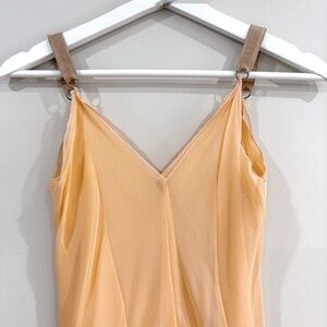 Elegant and rare Jes Wade reversible slip dress in a peach tone. Features a flowing silk chiffon overlay with an asymmetrical handkerchief hem and unique double-sided wear design for versatile styling. The shoulder straps with metal ring accents add a modern touch. While no size or fabric tag is present, it best fits approximately a Small based on measurements (please see photos). Perfect for weddings, cocktail events, or dressed down with a denim jacket for chic daywear.