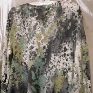 Absolutely lovely high quality sweater with a hint of leopard in this design. The fabric is made of a polyester spandex blend. It can be machine washed and flat dried. It is made in the USA. It is coming from a smoke free, pet friendly home, Excellent condition.