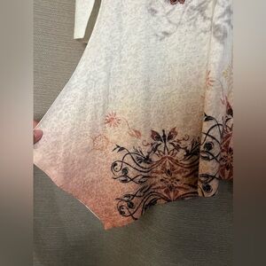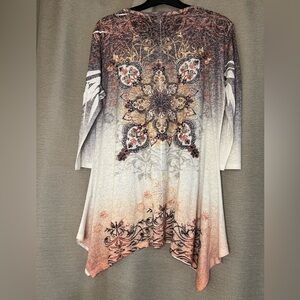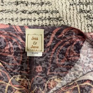 Pre-owned condition like new, size XL, 50% cotton 50% polyester, 3/4 sleeves, semi sheer. Please see photos for measurements.