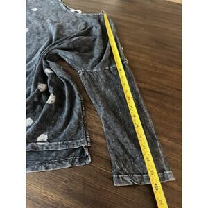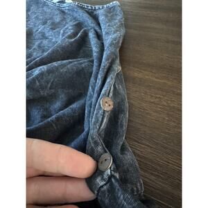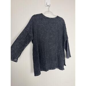 Design details: Scoop neckline, 3/4 length sleeves with button detail along shoulder and upper arm, relaxed fit, double-layer look asymmetrical hem, soft mineral-washed knit fabric with intentional distressed effect.