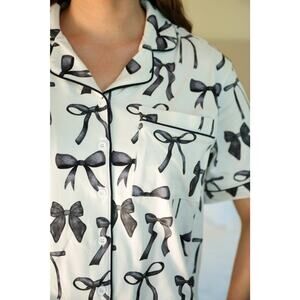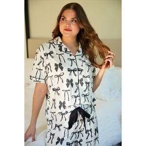 Our fan favorite pajama returns, now with pants! Meet the Midnight Bow Pant Ruffle Pajama Set, showcasing our top-selling bow print, a button-up short sleeve top, and whimsical ruffle pants accented with a decorative tie. Get set for a cozy and delightful night’s sleep!