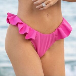 Dive into style with these vibrant pink playful ribbed ruffle hipster bikini bottoms by Jess Southern. Perfect for making a splash at the beach or pool. Matching bikini top not included, but available in a smaller size in the closet.
