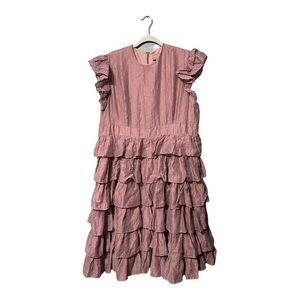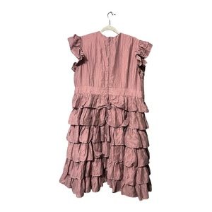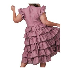 Charming pink dress with layered ruffles. Short sleeves with ruffle detail. Perfect for special occasions.