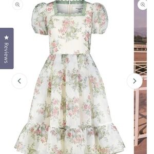 This elegant knee-length dress is a soft cream . It features charming puff sleeves and a distinctive square neckline, beautifully accented with intricate green lace detailing. The dress is adorned with a delicate rose floral pattern.