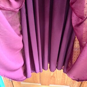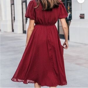 Jessake Highbury elegant flowy burgandy dress with Swiss dots, elastic waist, puffed sleeves, and faux front buttons