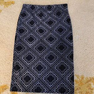 Jesse & J. Size Jr. XL. Pencil Stretch Skirt. Back Vent. Elastic Waist. Poly/spandex. Length 28.5". Waist 32-34". Hips 38". Measurements taken unstretched. Excellent pre-loved condition. No spots, tears or damage.
