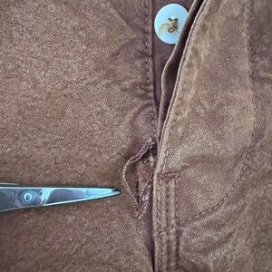 Loveliest Jesse Kamm pants, in a warm brown/amber color. Actually in pretty great condition as pants, however they have a somewhat large vertical tear right next to the fly / buttons (reflected in price). I’ve tried to capture this / the size of the tear in photos. I think that these can be mended with a quick stitch pretty easily, but I never ended up getting around to it and don't really wear this color much. :( Selling as-is and hoping someone with mend/love them!