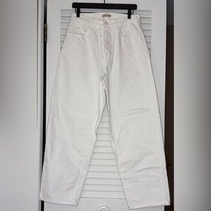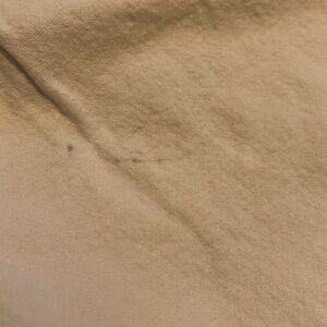 These are the very best pants ever. They’ve been in my dresser drawer for a while (white isn’t really my color) and have a slight mark at the left knee from rubbing. Might come out with a good spot clean.