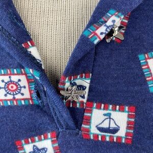 Super cute and unique pool wear by Jessi Lee featuring a nautical theme and starfish buttons. The top measures 21 inches armpit to armpit laying flat and 28 inches in length from shoulder to hem. The shorts measure 13 inches at the elastic waist laying flat and have an 8 inch inseam.