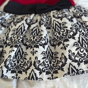 2T girls' holiday dress with a red velvet bodice and black and white damask-print skirt.