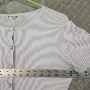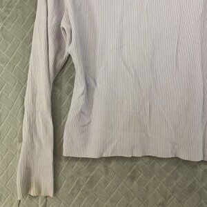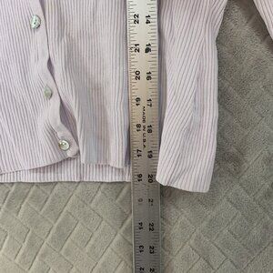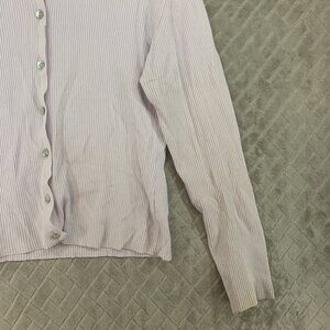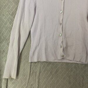 Jessica Ash Womens L Top White Cardigan Mother of Pearl Buttons Rib Knit Fitted. This shirt has a few small light stains throughout. No holes.