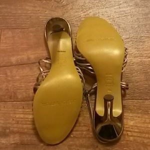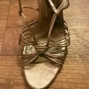 Awesome detailed gold metallic slingbacks. NEVER BEEN WORN. Look at the soles. Tried on only. They have beautiful detail and are extremely comfortable. The slingback has an adjustable dainty buckle. Small scuff on the sole of the left shoe. Please see third picture. No tags/no box/brand new.