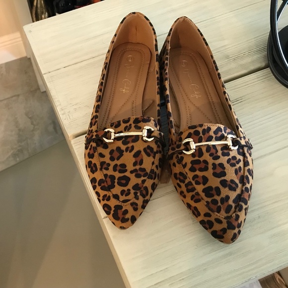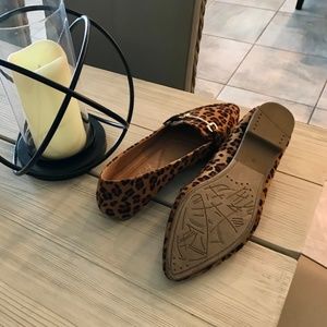 Vegan Suede slip on pointy toe ballet flat loafer leopard with gold tone hard wear accent in toe. Lightly padded footbed All man made materials. Excellent condition