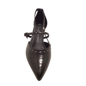 Step out in style with the Jessica Carlyle Women's Petra Studded Strappy D’Orsay Kitten Heels. These elegant heels feature a sleek black faux leather upper adorned with subtle studded accents, creating a sophisticated and chic look perfect for any occasion. The pointed toe and low kitten heel provide a comfortable and timeless silhouette that complements any dress or pant ensemble.