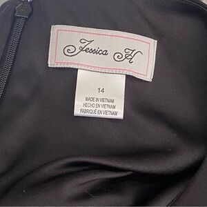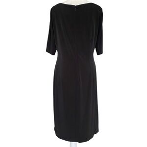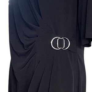 Black faux wrap with silver buckle at side ruching. Pretty silhouette. Fully lined and back zip.
