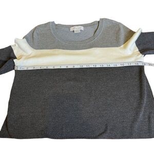 Jessica H Sweater Dress Striped Gray, Khaki, Orange Petite L. Great condition. Fun elbow patches. See photos for all details and measurements. Check out my closet for more items to add for only one shipping fee.