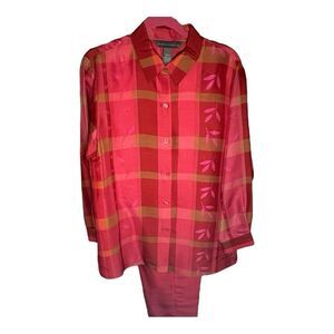 Jessica Holbrook 3 piece set in pink color. All three pieces 100% silk. Includes button-up shirt with subtle leaf patterns. Also includes sleeveless undershirt in sold pink color and solid pink pants. Perfect for a bold, stylish look.