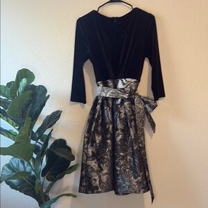 Jessica Howard size 10P. Top is black velvet and skirt is shimmery silver and black floral. Skirt has tulle underneath for more volume. Belted waist. Zippered back closure.