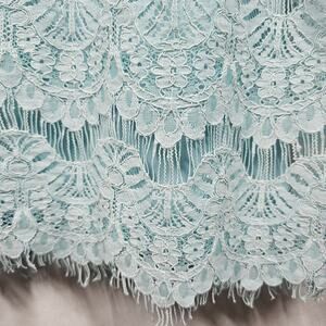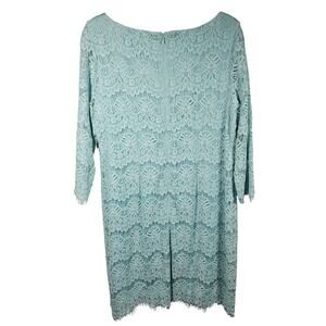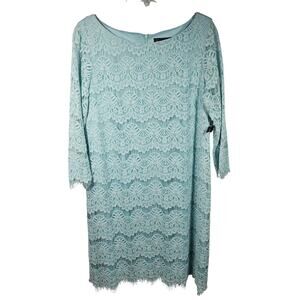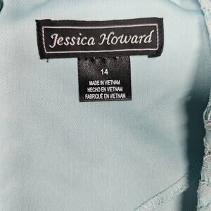 From Jessica Howard, this dress is designed with 3/4 length peekaboo lace sleeves, a pretty scalloped hem softened with an eyelash fringe, a boat neckline, and invisible back zipper with hook-and-eye closure. The shift dress can be used for a special occasion or even something more casual. It comes to the knee and is made of rayon/cotton/nylon fabric. The dress lining is polyester. The mint (or light teal) dress is NEW WITH TAGS and is a Women's Size 14. No flaws are noted.