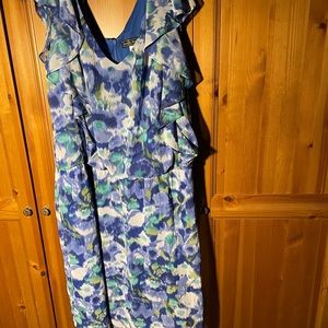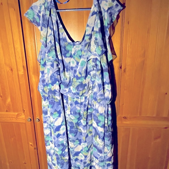 Multi Color Blues, Sleeveless, Zip-up In Back, Ruffle Down Side Shell 100% Poly, Lining 100% Poly PTP 27, L 44