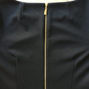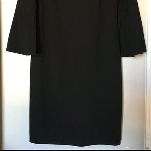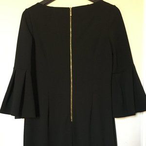 Classic black all-occasion dress. Heavyweight fabric with jewel neckline. Carefully crafted for flattering fit with darts on each side down the back. Gold zipper. Pleated bell sleeves hit above the wrist. Hem is at the knee on me (5'7"). Fully lined body.