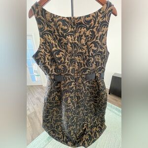 Elegant sleeveless dress with intricate gold bronze patterns. Features a stylish black bow at the waist. Perfect for formal occasions.new without Tags size 16.