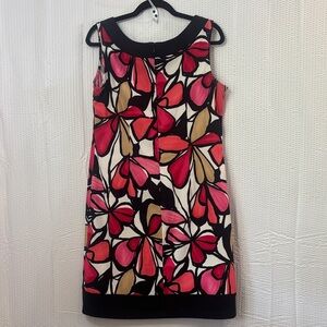 Bold and beautiful sleeveless sheath dress with a vibrant abstract floral print in pink, red, and cream tones. Designed with a flattering notched neckline and black contrast trim at the neck and hem. Perfect for weddings, church, or the office.