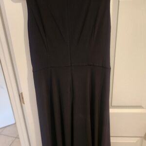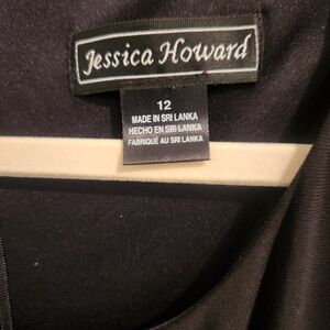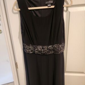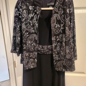 Special occasion black dress with silver floral patterns. Dress has accent waist band matching the jacket.