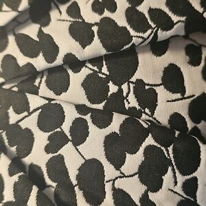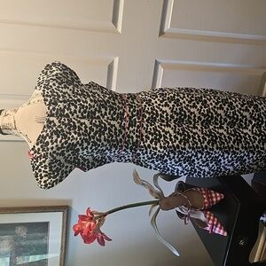 Jessica Howard Chic black and white pattern dress with a stylish pattern. Dress features double piping around the waistline with an accent of black sequin flowers on one side. Bustline is pleated for and even more flattering look. There are two lined pockets for incidentals. Wear to a party, funeral, house of worship, or a special work function. Pair with pink or black heels with a matching wrap.