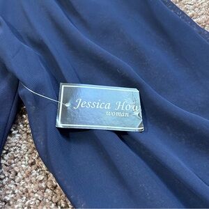 This elegant blue dress by Jessica Howard showcases a pleated A-line silhouette, perfect for a wedding guest or cocktail event. The V-neckline and long bishop sleeves add a sophisticated touch, while the pleated design enhances its graceful appeal.