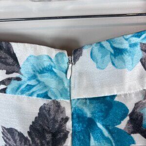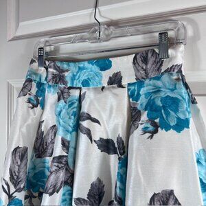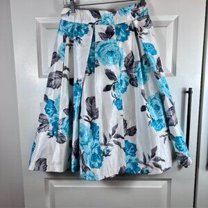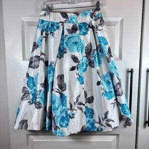 Elegant and feminine Jessica Howard midi skirt featuring a bold blue and gray floral print on a soft ivory background. This classic fit-and-flare silhouette includes box pleats for structure and movement, plus a hidden side zipper for a smooth fit. The skirt is fully lined with a layer of tulle for volume, giving it a timeless, polished look — perfect for weddings, garden parties, or special occasions.