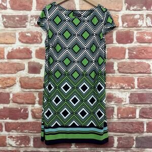 ▪️ Women’s Dress: Scoop neckline, pull on, retro style diamond abstract striped pattern, stretchy, and short sleeves. Pre-owned. Wear it with your favorite flats or heels!