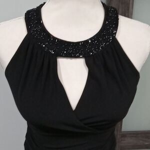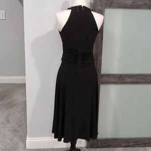 Halter neck midi dress with criss cross cut out. side ruching, back zip and lightly linen cups. 95% poly 5% spandex. In excellent condition