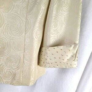 Chic blazer by Jessica Howard. Ideal for a polished look. Gorgeous evening wear Blazer jacket by Jessica Howard that is in like new condition. This Blazer features a beautiful Etched design, 3/4 sleeves, matching fabric button, one button style, and adorable tiny rhinestones on the collar and sleeve. This shimmering little jacket would be great for a night out or event.