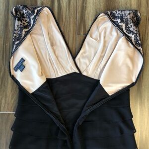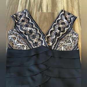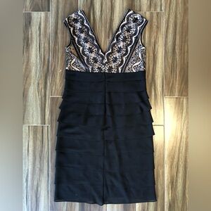 This dress is in excellent used condition (EUC); only worn once. Gorgeous v-neckline in front and back with beautiful black lace. Shutter pleated skirt is figure-flattering.