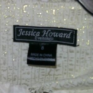 Keywords: Jessica Howard dress, bolero set, shrug set, cocktail dress, party dress, formal dress, ivory dress, gold dress, womens dress, size 8, evening dress, special occasion, wedding guest, classic dress, fitted dress