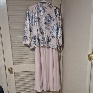 Elegant floral dress set with matching jacket. Soft pink base with gray floral patterns. Perfect for weddings.