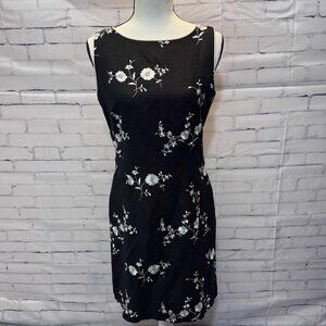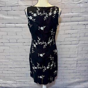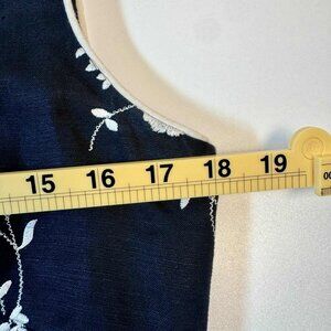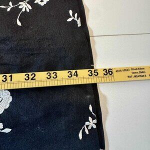 Size 10. Vintage. Beautiful condition, no visible flaws. Lined. Linen & rayon. Gorgeous black linen dress with white embroidered floral designs and white piping. Zips up the back. This dress is absolutely lovely. Boxy fit.