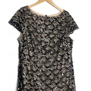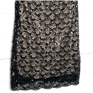 Jessica Howard black and nude formal cocktail dress, size 6. This elegant sheath dress features a black lace overlay with intricate sequin details over a nude lining, creating a sophisticated art deco-inspired look. The dress has cap sleeves and a scalloped hemline, making it perfect for a cocktail party, wedding, or other special event. The back has a zipper closure. Cute cap sleeves.
